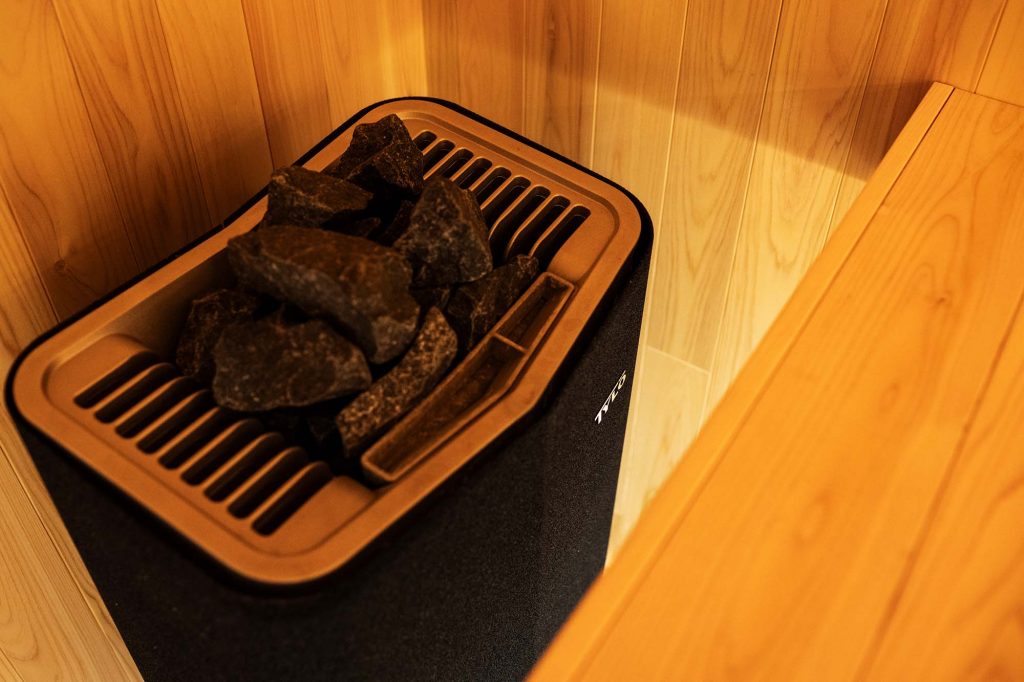 採用したのは、ロウリュが楽しめて、安全性と体感温度のバランスにすぐれた「Tylö(ティーロ)」のドライサウナ。石が熱を蓄え、じんわりとした心地よさを生み出す