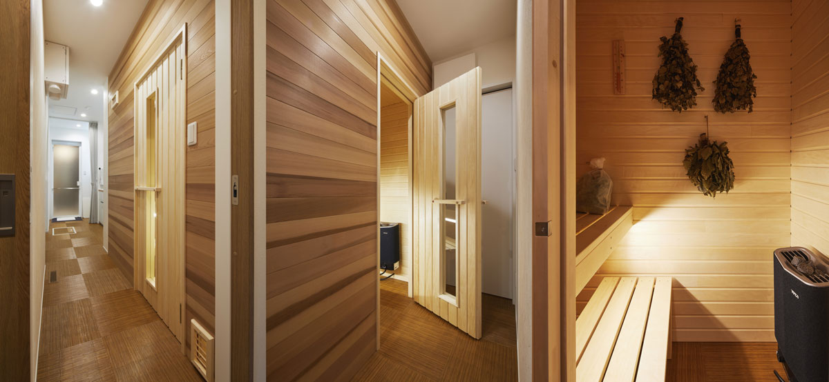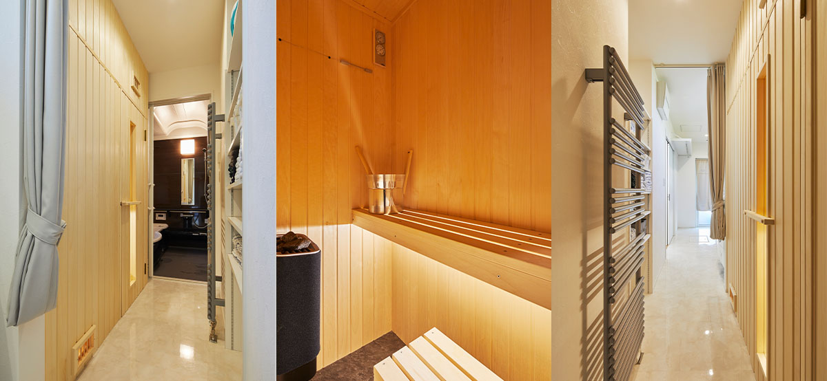 左:アスペンという木を外側に張って仕上げたサウナルーム。通路の突き当たりが浴室で、サウナと行き来がしやすい 中:スウェーデン・ティーロ社のドライサウナを採用。広さは約1帖で、内壁は全面ヒノキ張り。木の香りがリラックス効果を高める 右:サウナを含め、水まわりを一列に配した機能的な動線