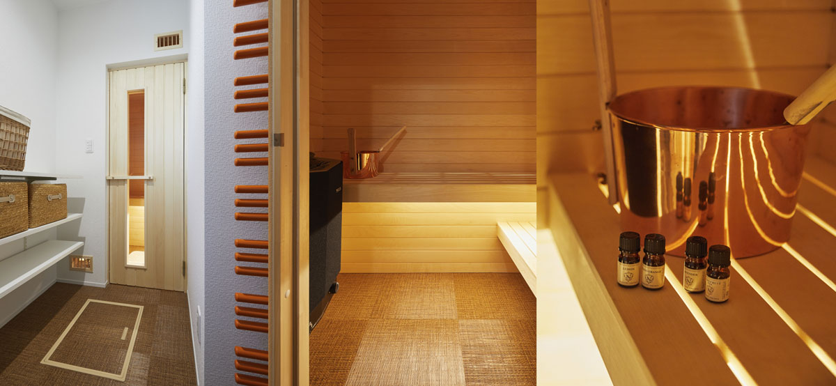 左:洗面脱衣室の奥には、奥さんの希望で取り入れたサウナルーム 中:約1.5帖のサウナルームは二人で入っても余裕の広さ。壁に張ったヒノキの香りが心地よい 右:その日の気分や体調に合わせてアロマオイルで香りを変えながら、サウナライフを楽しんでいるそう