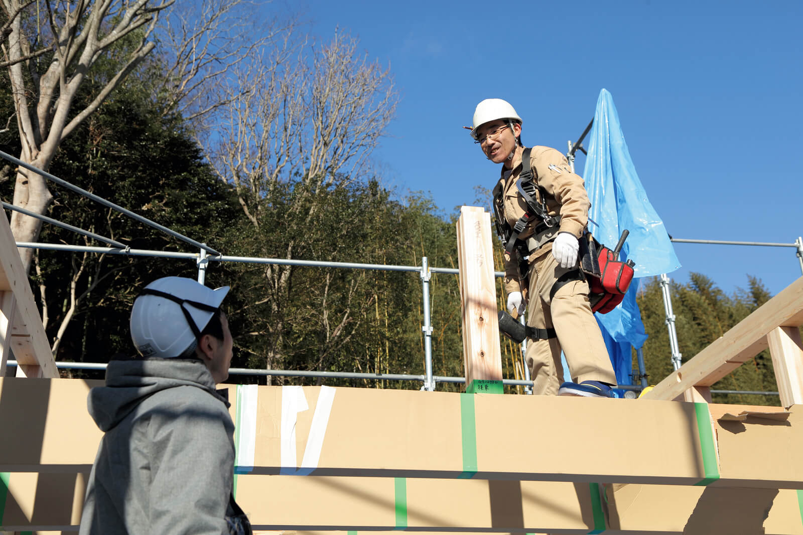 家の構造を組み上げた後は、建物全体にブルーシートをかけて養生しています。というのも、構造は雨や雪で濡れると乾くまでに数日を要し、カビの原因になりかねないからです。ブルーシート養生は手間はかかりますが、工程・品質・安全のすべての面において必要なこと。職人さんも理解して取り組んでくれています。