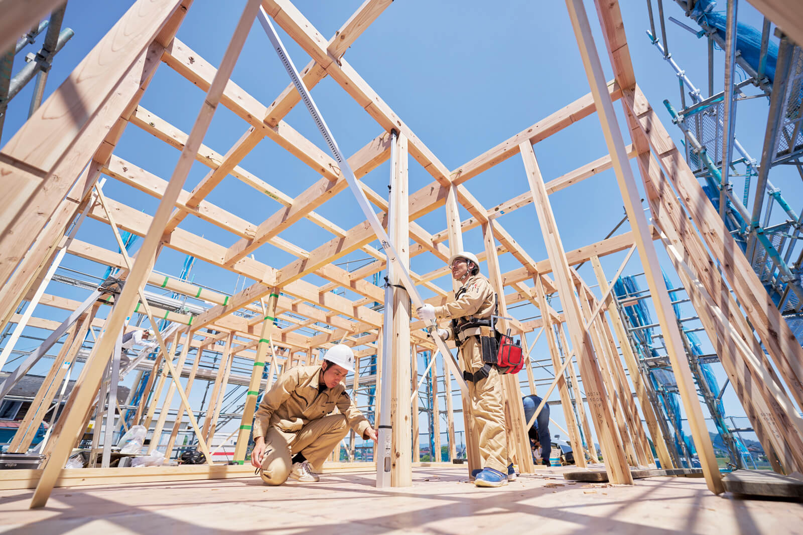 現場では、現場監督の指示のもとで大工たちが効率的に作業を進める