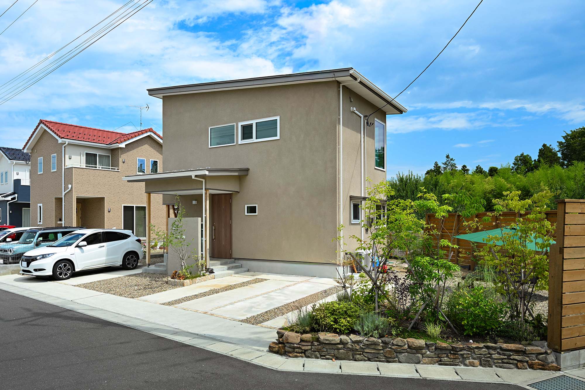 並行して土地探しにも時間をかけ、最終的に見つけたのが、それぞれのご実家の中間に位置し、前面に川が流れる緑豊かな土地でした。「立地や環境が気に入りました。ヒノケンさんにも『いいね』と言っていただけて、背中を押されました」。