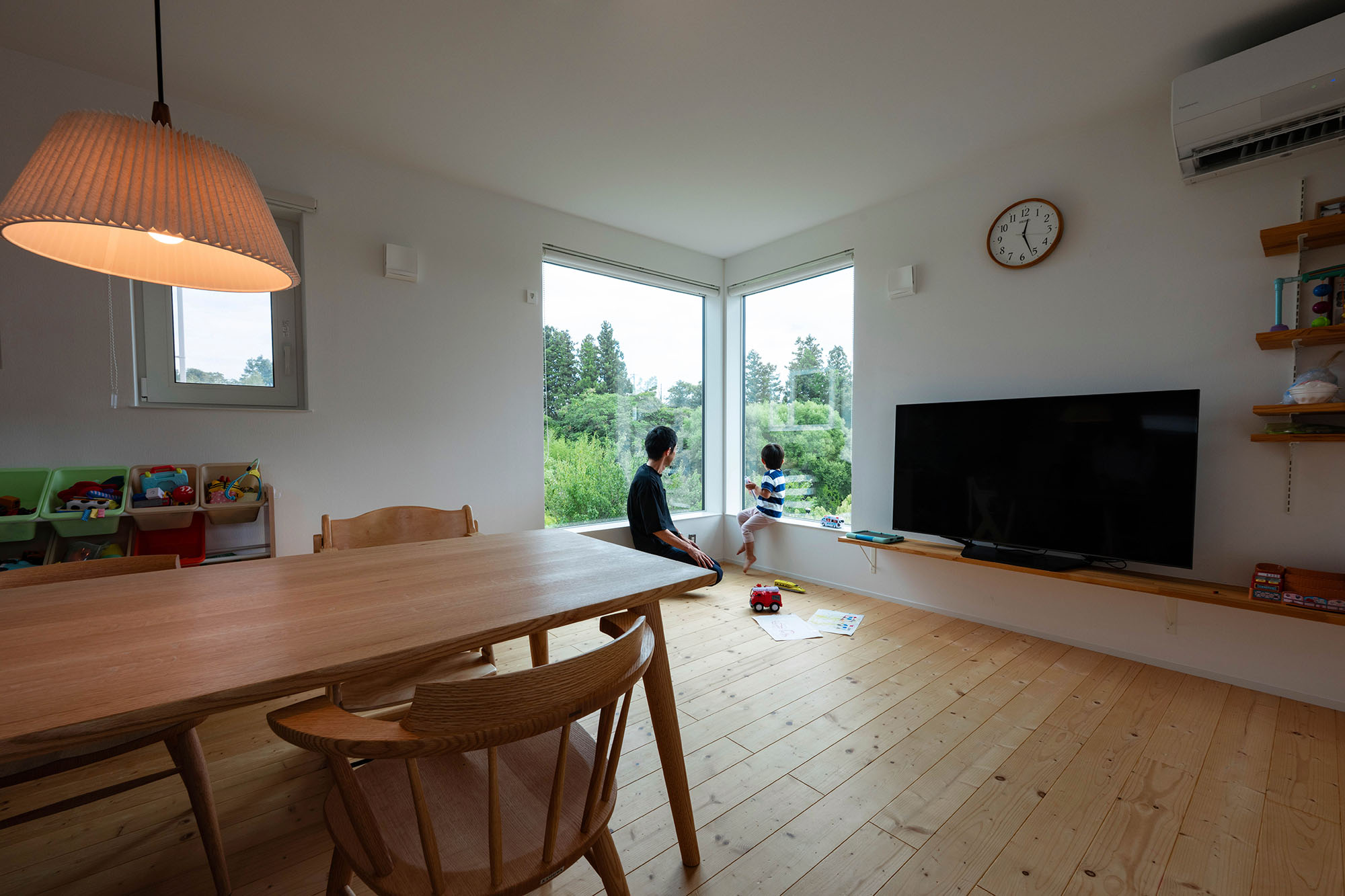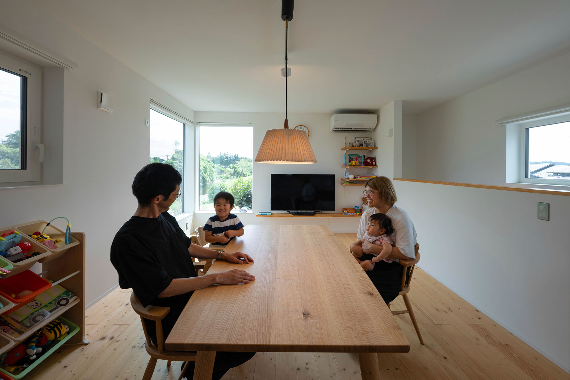 完成した住まいは、27坪のコンパクトな2階建て。その中に、暮らしやすさがぎゅっと凝縮されています。最大の特徴は、プライバシーを守り、開放感も得られる2階リビングのプラン。東面と南面のコーナーに設けられた窓からは、季節ごとに移り変わる川沿いの風景を望むことができます。