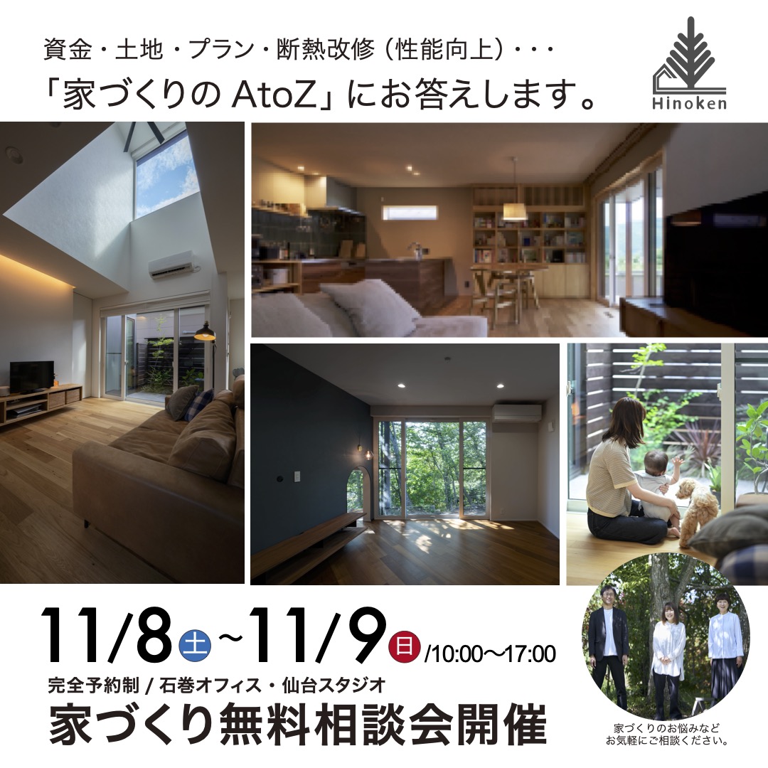 ヒノケンでは、11月8日(土)〜9日(日)の2日間、石巻オフィス・仙台スタジオにて「家づくり無料相談会」を開催します。