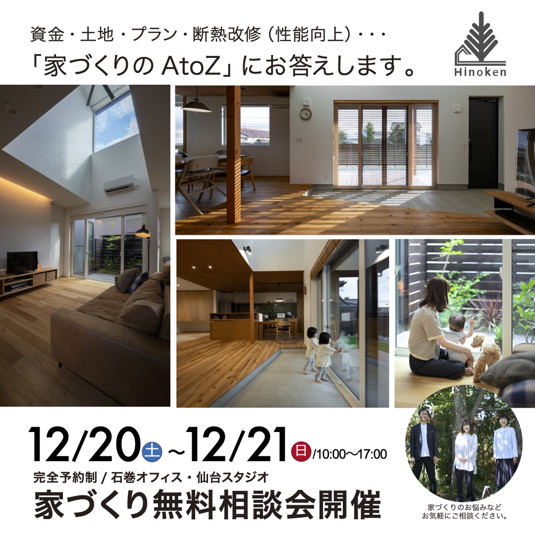 ヒノケンでは、12月20日(土)〜21日(日)の2日間、石巻オフィス・仙台スタジオにて、年内最後の家づくり無料相談会を開催します。